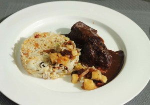- geschmorte Lammhüfte | Kruste mit Dukkah (ägyptische Gewürz/Nuss-Mischung) | Safran-Reis mit Mandelstiften | Sauce mit Trockenfrüchten & Ras-el-Hanout