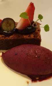 (im Herbst ´25 abgefüllt, von drei Jahren im Holz gereiftem Spätburgunder mit Merlot)- ein Küchlein mit bester Schokolade begleitet von auch für Desserts bestens geeigneter roter Bete